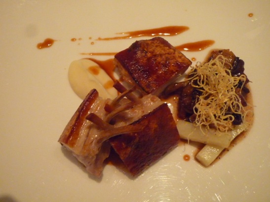 After touching heaven we were back on the earth, tasting a grilled black grouper, which is a fish from New Zealand far from tender, with zucchini and zucchini flower, ginger, lentils, and veal and black pepper sauce. A perfect example of a "mountain and sea" dish, where a fish is combined with a meaty and spicy sauce to enhance and balance flavours. I did not become a fan of the black grouper, but the dish was well executed and the zucchini and ginger crunchy, this latter adding another layer of spiciness to the combination.The meat main was a choice of one of three dishes: i ) slow cooked suckling pig; ii) slow cooked beef cheek; and iii) venison with chocolate sauce. We left the venison out (it was a hard decision). All three dishes were served with mushrooms, pure, jus from the respective meat and other details of which I could not identify.